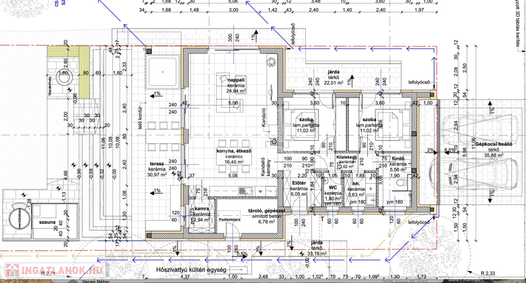 A ház 94 m2, tartozik hozzá még 30,97 m2 terasz és 35,88 m2 autóbeálló.
