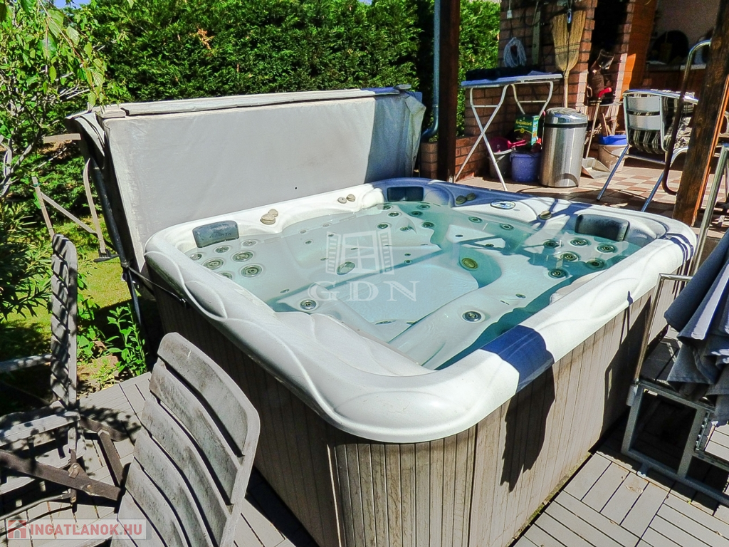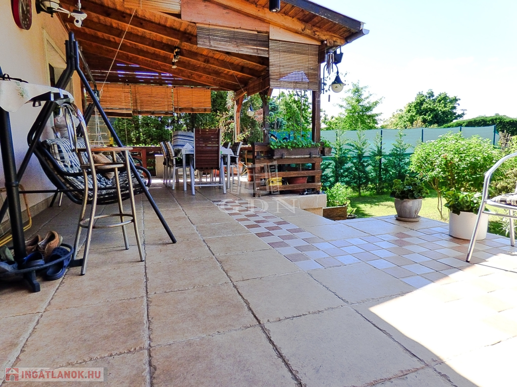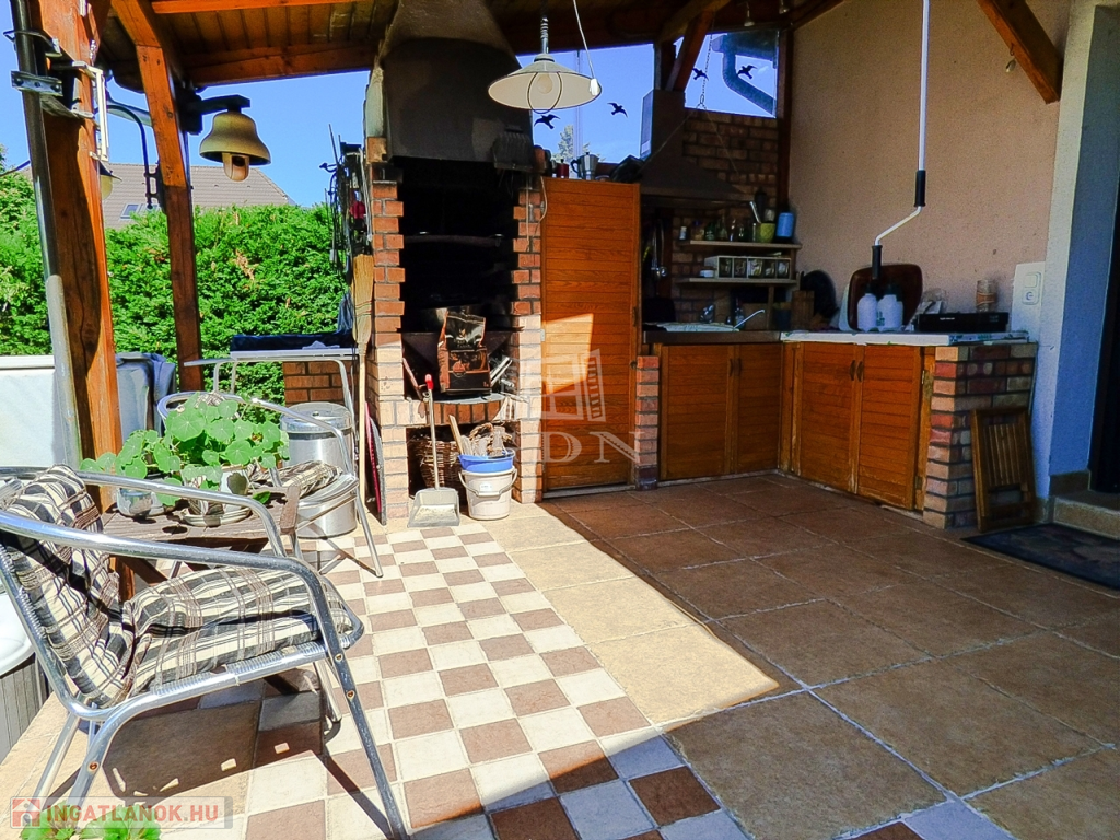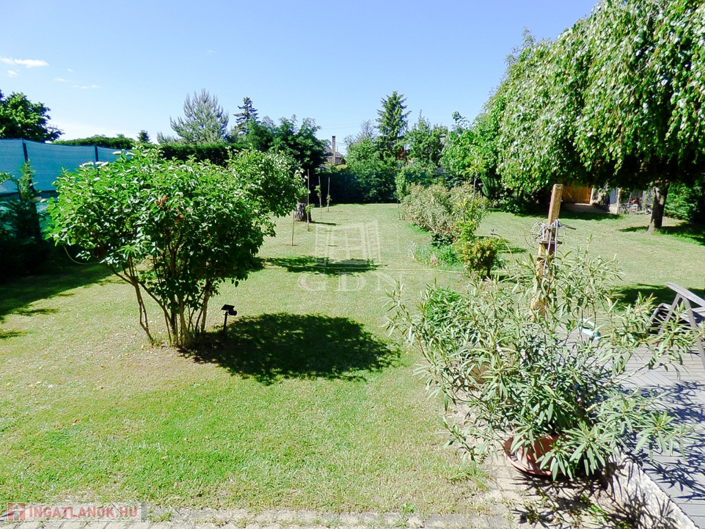 A kert rendezett, öntöző rendszerrel, fúrt és ásott kúttal ellátott, hobby állatoknak kialakított kenellel és egy tárolásra alkalmas 9 nm-es kis faházzal.