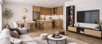 Tágas, világos nappali-konyha-étkező egy légtérben