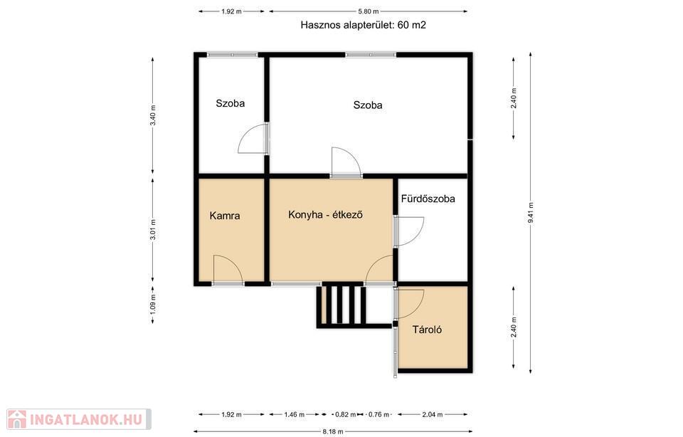 Az ingatlan 60 m² alapterületű, praktikus elosztású: