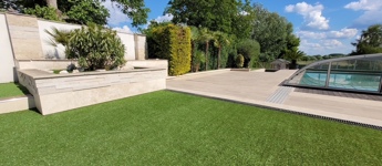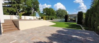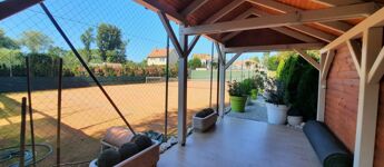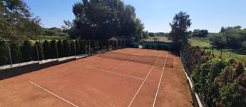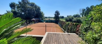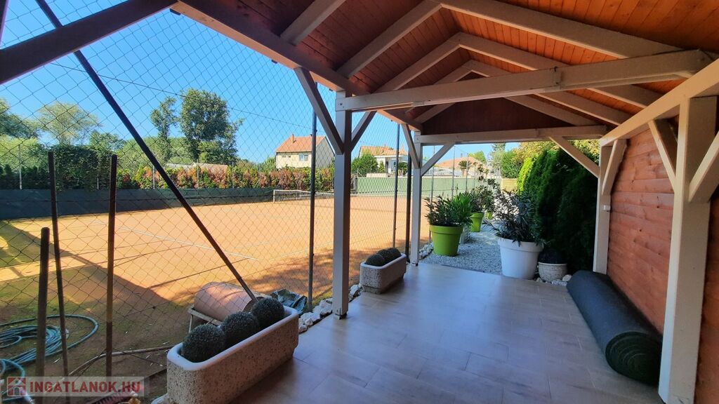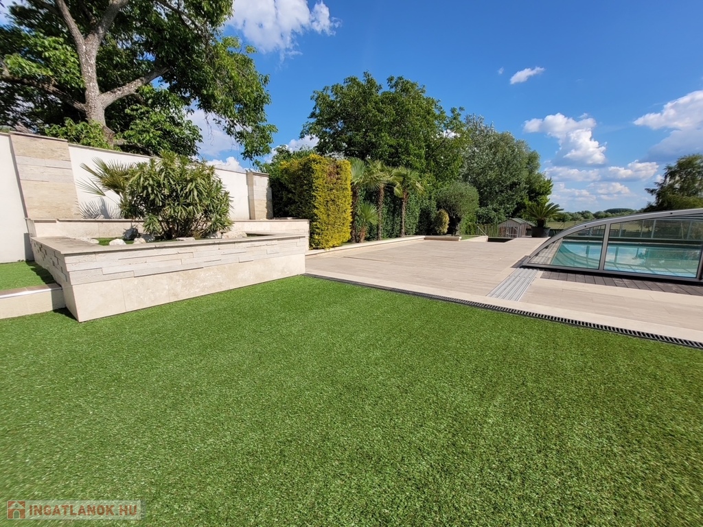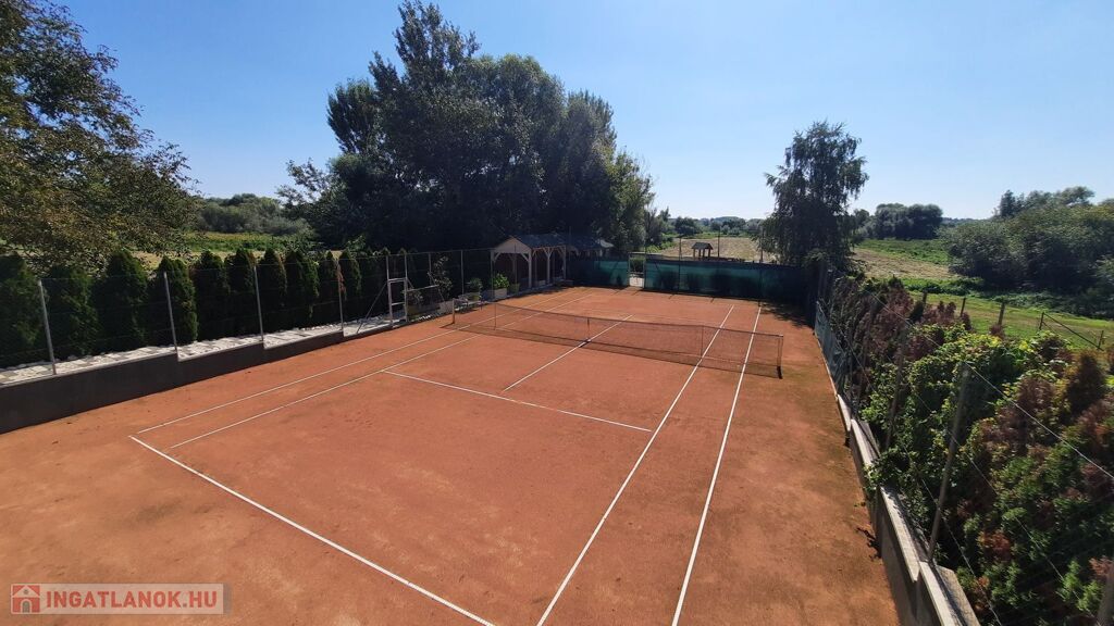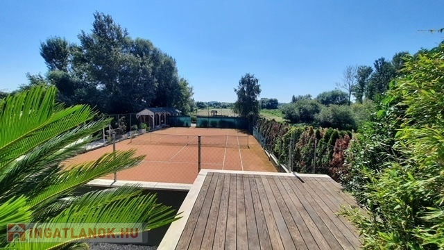 A külső tér valódi luxust kínál: a kertben egy saját teniszpálya kapott helyet, kiszolgáló melléképülettel (nyári konyha, mosdó, tároló), valamint egy 7×13 méteres, fűthető medence, amelyhez egy 70 m²-es fedett és egy 100 m²-es nyitott terasz kapcsolódik. A gondosan kialakított, mediterrán növényzettel beültetett kert tökéletes privát oázist teremt.