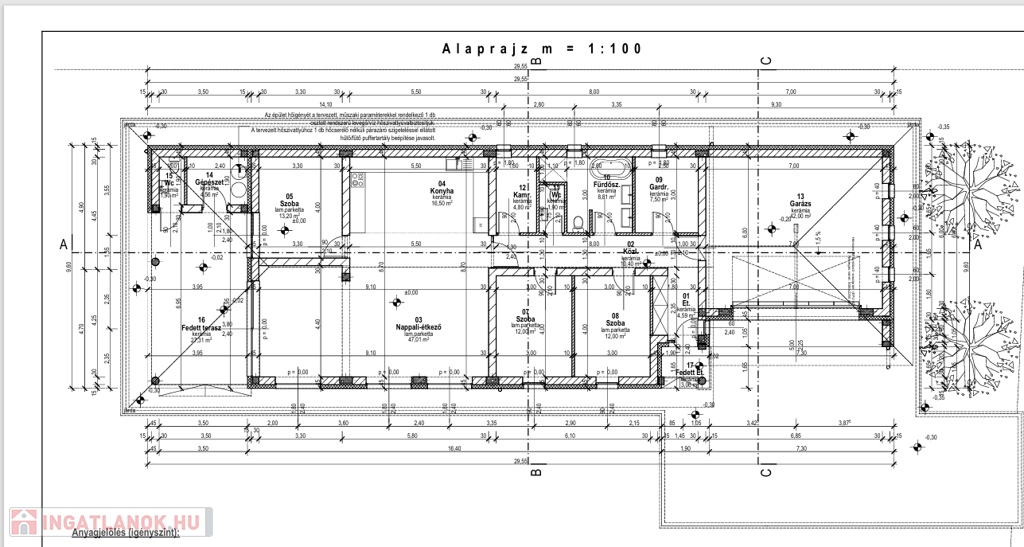 A ház 187 m² lakótérrel,3 hálószoba + nappalis kialakítású, 29 m²-es fedett terasszal, valamint 42 m²-es, kétállásos garázzsal rendelkezik. A belső tér jól átgondolt elrendezésű, külön mosókonyha és kazánház is helyet kapott, így a mindennapi élet kényelmesen szervezhető.