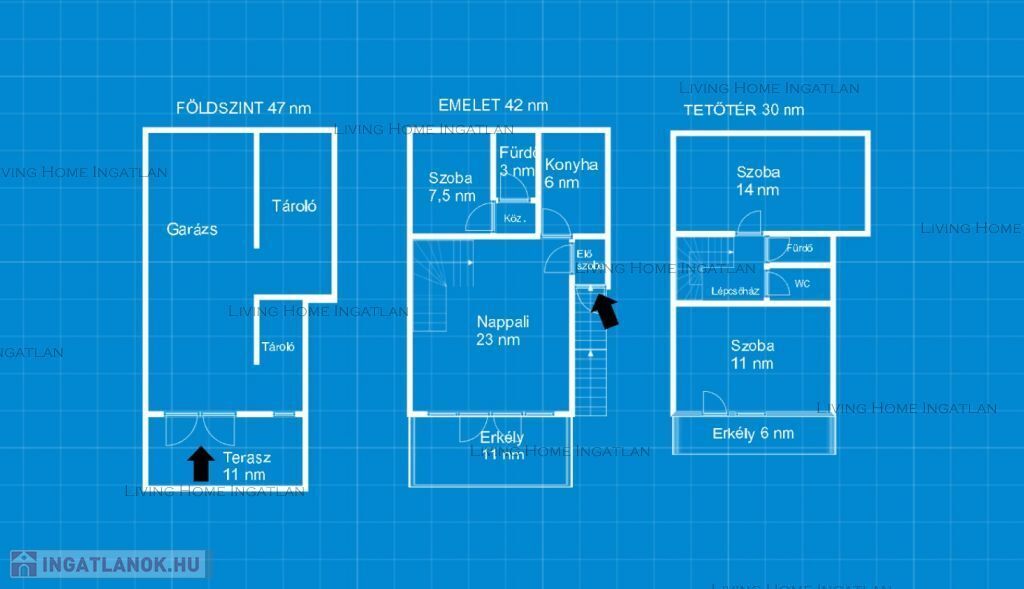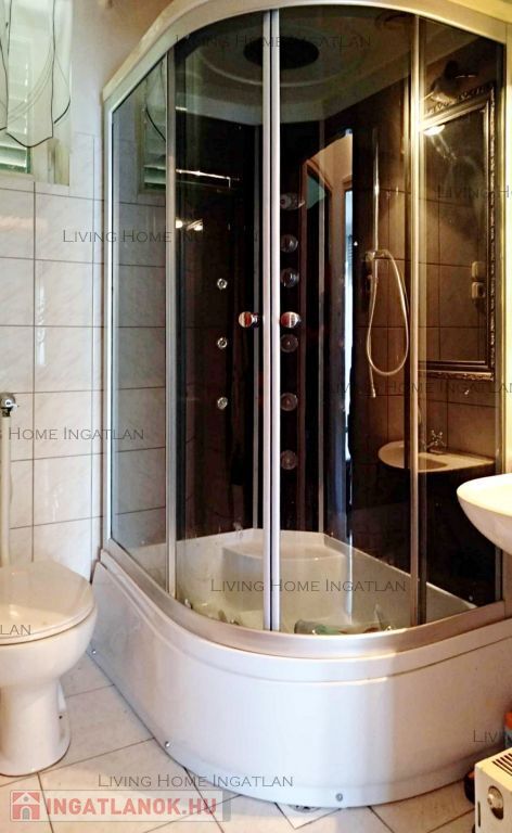 Felső szint: két hálószoba, zuhanyzós fürdő, WC, két erkély.