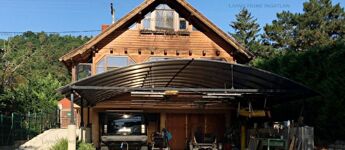 A unique, three-story, modern family home with direct access to the Danube and its own small boat harbor is for sale in Leányfalu. The natural wood facade gives the house an alpine feel, allowing it to blend in perfectly with its surroundings. The spacious front yard provides ample parking space. If you dream of living by the water, this property is a rare opportunity! The house is located in a green environment, surrounded on both sides by plots with mature trees.