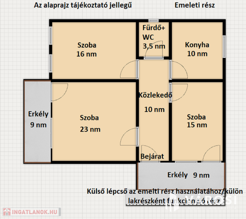 Az ingatlan emeleti része lakható, átlagos állapotú. A nyílászárók majdnem mindenhol ki lettek cserélve. Viszont a gépészet itt még a régi, tehát a villany és a víz vezetékek cseréje ajánlott, bár minden működik most is.