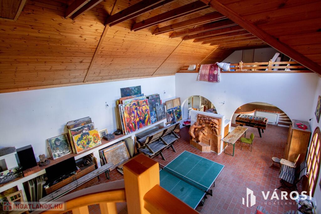 Az ingatlan remek választás olyan embernek, akinek szüksége van alkotói térre vagy a munkája miatt hasznosítani tudja a közel 120 nm nagyságú művészi részét a háznak, de akár befektetési célra is kiváló választás. A ház lakrésze 140 nm hasznos alapterületű, itt akár 4 szoba, 1 nappali, 1 előtér + étkező, 1 konyha és 1 fürdő+ WC található, jelenleg ez is egyedi stílusba van berendezve, de az elosztása adott, abból könnyedén kialakítható egy nagyobb család számára praktikus lakrész.