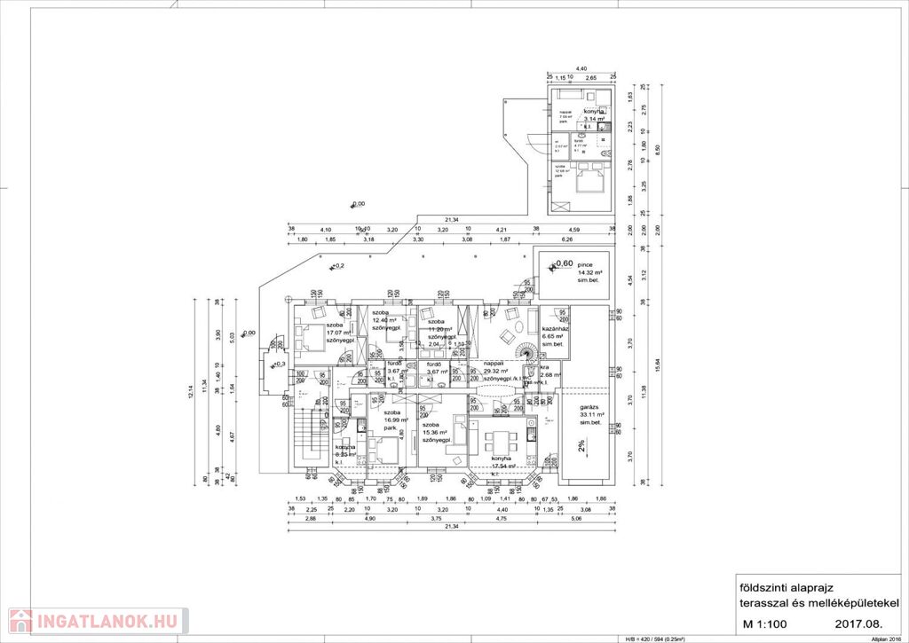 - FÖLDSZINT 170,08 m2: nappali, étkező-konyha, kamra, 5 db szoba, 2 fürdőszoba, 2 WC, előszoba, lépcsőház, konyha kamrával.