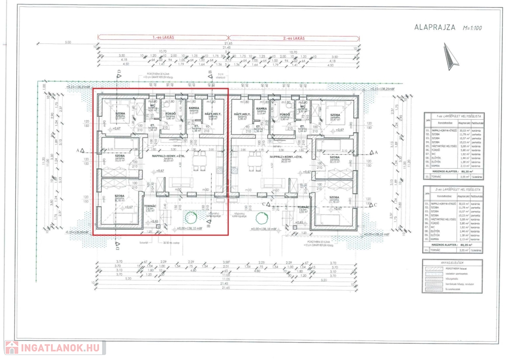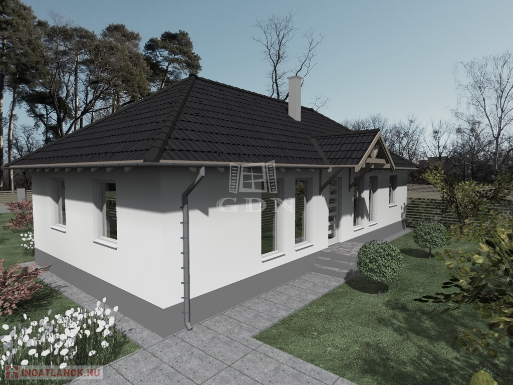 Az ingatlan 30 cm-es Porotherm X-therm okos téglából épül, 10 cm-es grafitos szigeteléssel, fa födémmel, beton cserép fedéssel.