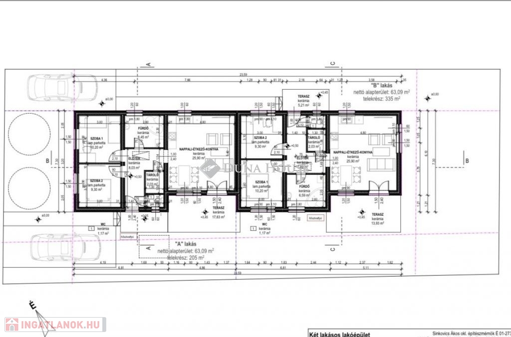 Kialakítása: 2 szoba, fürdő, külön wc, előtér, tároló, nappali+étkező konyha, 18 m2 nyitott terasz.