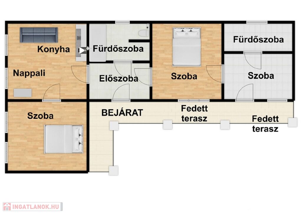 -a lakóingatlan, a 100m2-es lakrész( nappali konyhával, 2 lakószoba, közlekedő és 2 fürdőszoba kapott helyet)
