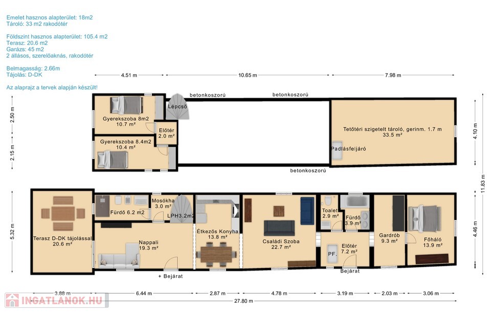 ház hasznos területe: 124 m2, terasz: 20.6 m2, garázs: 45m2, tároló: 33 m2, telek: 1174 m2.