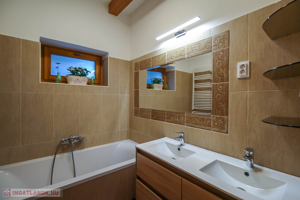 A hatalmas telek felső része panorámás, további lehetőségeket rejt magában, akár medence építésre is alkalmas. A megfelelő tető- falazat szigetelésről tesz tanúbizonyságot, hogy a nyári nagy melegben is csak 25-26 Celsius-fok van, légkondicionálás nélkül. Energetikai besorolása CC. A melegvíz ellátást és fűtést korszerű gázcirkó kazán biztosítja, utóbbit padlófűtéses, valamint lapradiátoros hőleadással. Az építmény belterülete is tovább növelhető az emelet részbeépítésével, mely 14m2. A ház központja az étkezős konyha, innen nyílnak a további helységek, extra tárolók, melyek pontos elrendezését méreteikkel együtt alaprajzon szemléltetem.