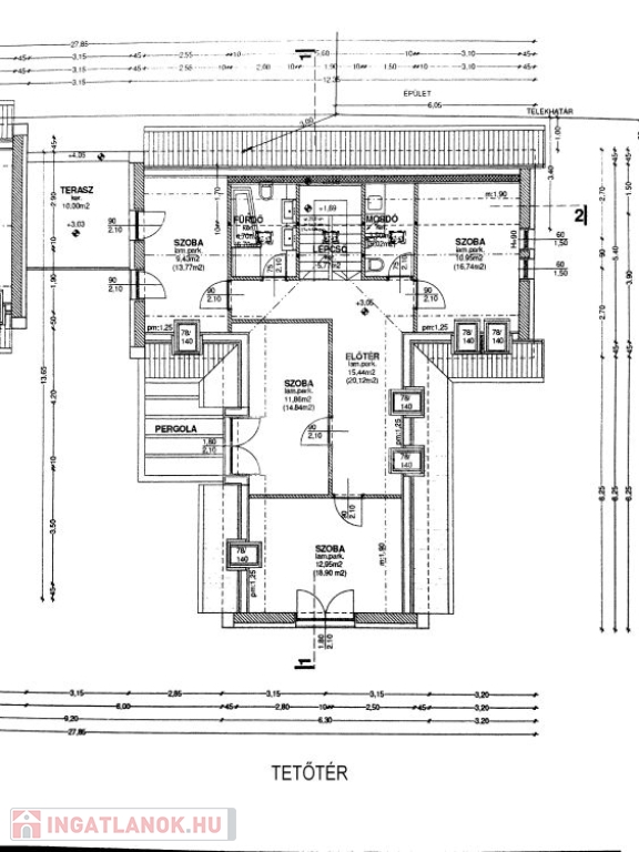 Emelet: 4 szoba (br. 18,9, 14,8,16,7 és 9,4 nm) 2 fürdőszoba (5,0 és 3,7 nm) + lépcsőház.