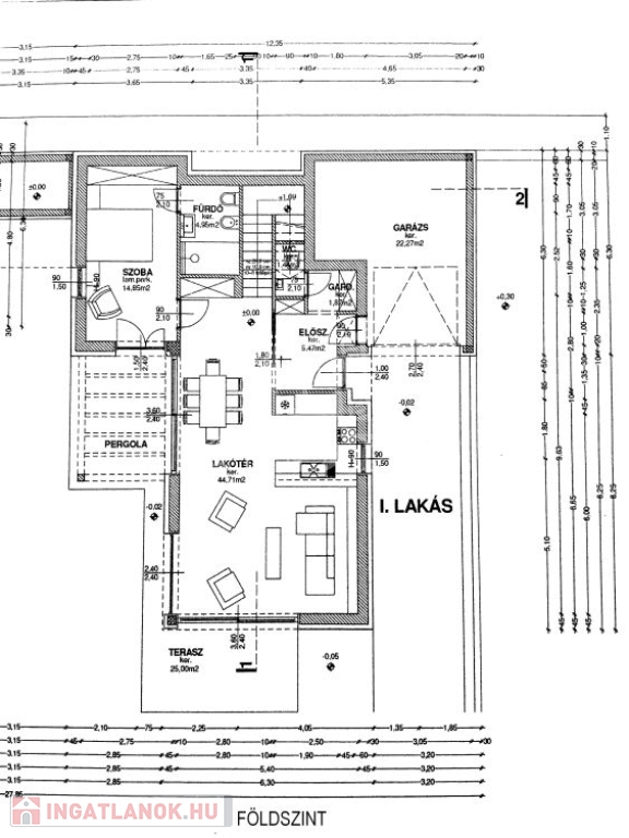 Földszinten Nappali-konyha-étkező (44,7 nm), szoba (14,8 nm), fürdőszoba, gardrób, előszoba + terasz (25 nm);