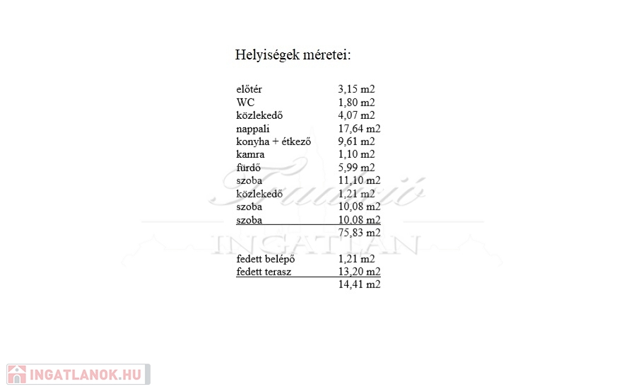 A lakórész elosztása: fedett belépő, előszoba, közlekedő, amerikai konyhás nappali étkezővel, kamra, 3 külön bejáratú szoba, fürdő és mellékhelyiség.