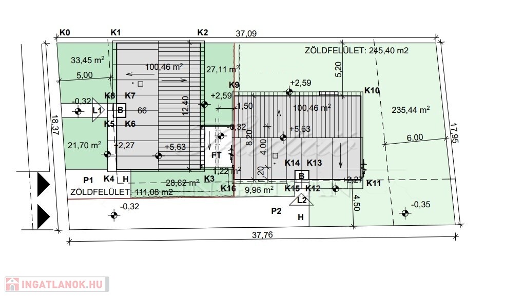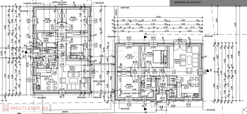 Az L1-es lakáshoz 257 m2 udvar és 12 m2-es fedett terasz is tartozik, az L2-es lakás 420 m2 telekhányaddal rendelkezik.