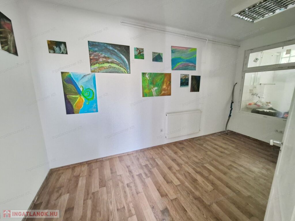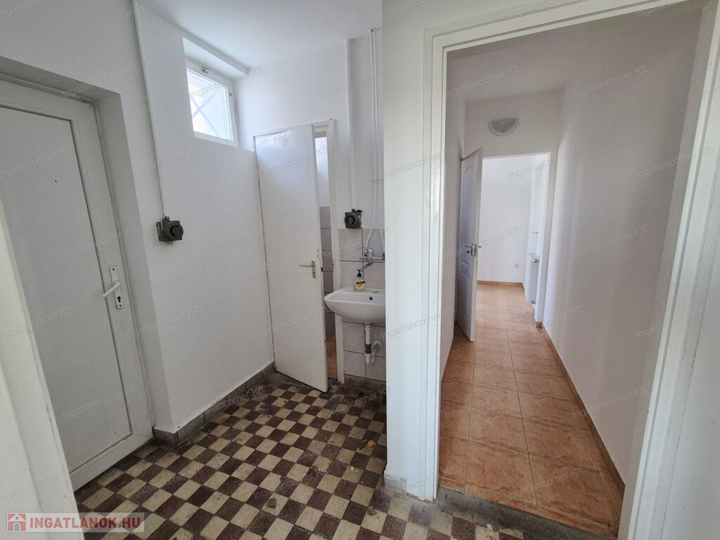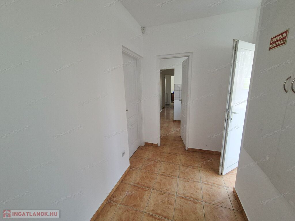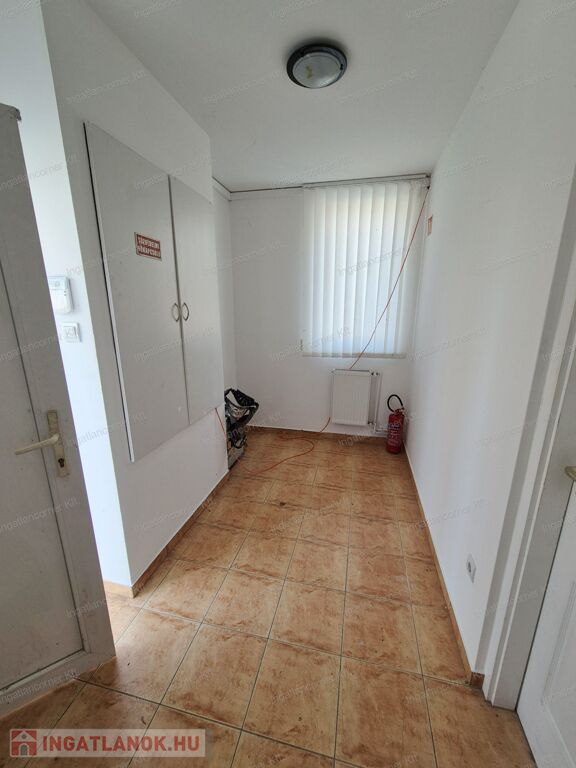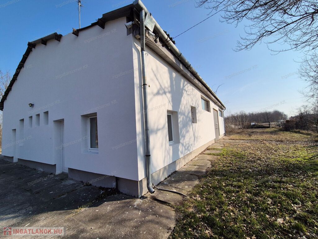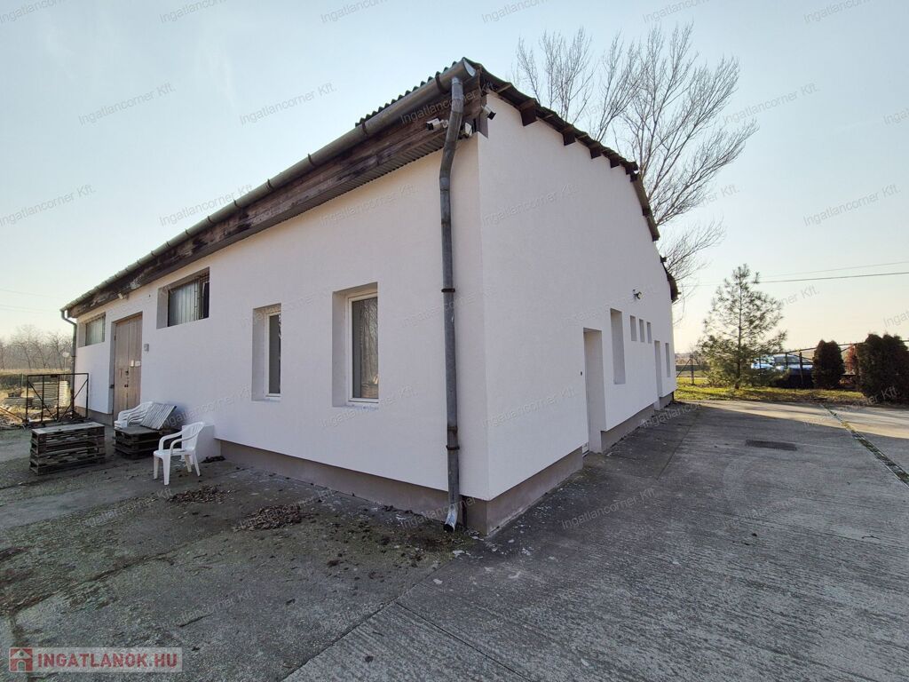 Az épület tégla építésű egyszintes épület, tavaly 10cm-es dryvit szigetelést kapott, belső és külső nyílászárói műanyag 2 rétegűek. Az épület egyik fele IRODAKÉNT FUNKCIÓNÁL, mely áll: 3 iroda helyiségből, két mellékhelyiség, konyhából és egy dupla zuhanyzóval felszerelt fürdőszobából áll, mely biztosítja a higiéniai szükségleteket. A telek bal sarkában egy dupla állású mobil garázs, tároló is elérhető.