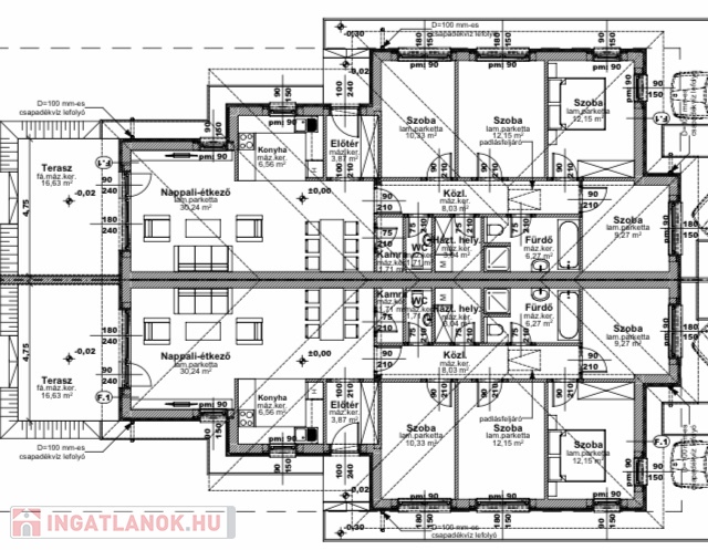 Az ikerház felek azonos nagyságúak, 122 m2 -esek (lakóterület:105 m2 + terasz:16 m2)nappali+4 szoba elrendezésűek,mely 400 m2 nagyságú saját