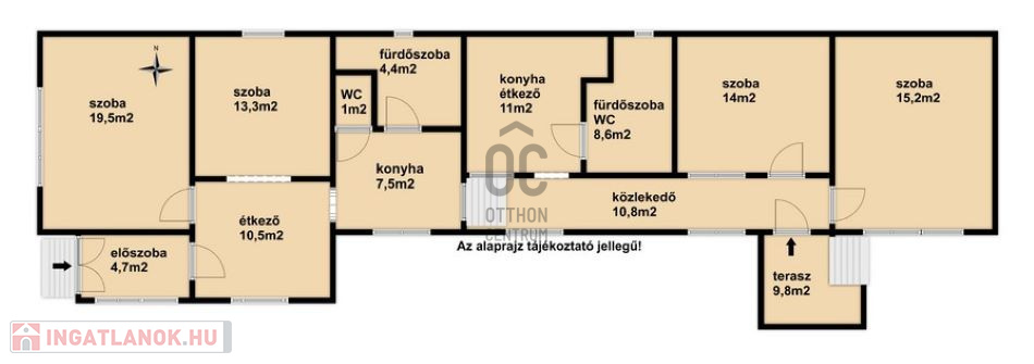 - A ház helyiségei: 4 szoba, 2 konyha, előszoba, 1 külön WC, 2 fürdőszoba (az egyik WC-vel), étkező, terasz.