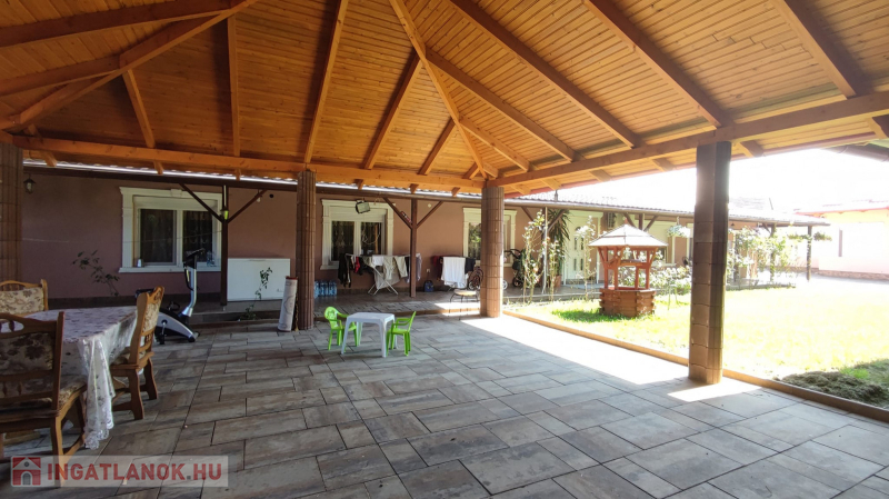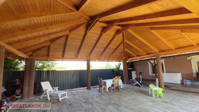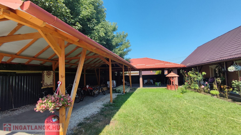 Az udvar viakoloros fűvesített, ki van alakítva egy fedett gépkocsibeálló, és egy hatalmas nagy kerti szaletli, ahol lehet sütögetni, és a családi összejöveteleket rendezni.