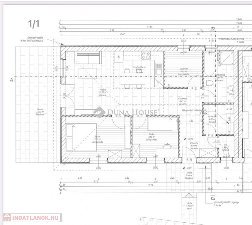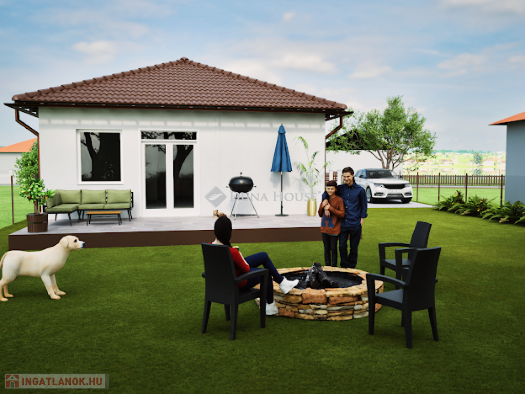 Kialakítása: 2 szoba, tágas amerikai nappali konyha, háztartási helyiség, gardrób , előtér, közlekedő, fürdő+wc, külön wc, nyitott terasz.