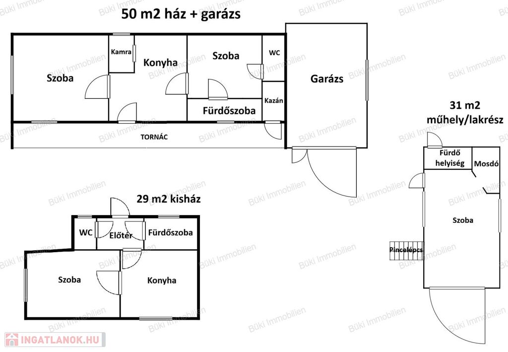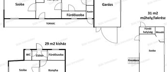 Három épület egyetlen területen, és még így is marad bőven művelhető, vagy beépíthető rész. A központi épület 50 m2 életteret rejt magában, kiegészülve egy garázzsal, amely autó tárolásra és műhely célra is alkalmas a maga 24 m2-ével. Vele szemben helyezkedik el a kisebb házikó, amelyben akárcsak a főépületben itt is található konyhahelyiség, fürdőszoba és külön mellékhelyiség. Saroktelekről lévén szó, az épületek felújítást követően külön-külön bérbeadhatók, a telek körbekerített, de több irányból vannak bejáratai, így akár teljesen elkülöníthetőek egymástól a lakrészek.