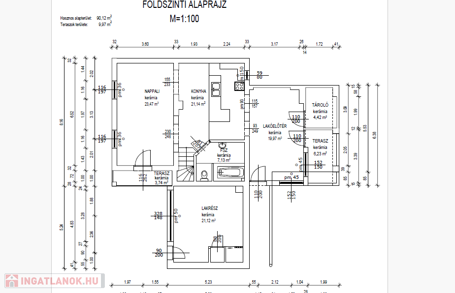 Földszint: külön lakrész és a fő lakótér (90 m²) nappalival, konyhával, fürdővel, teraszkapcsolattal