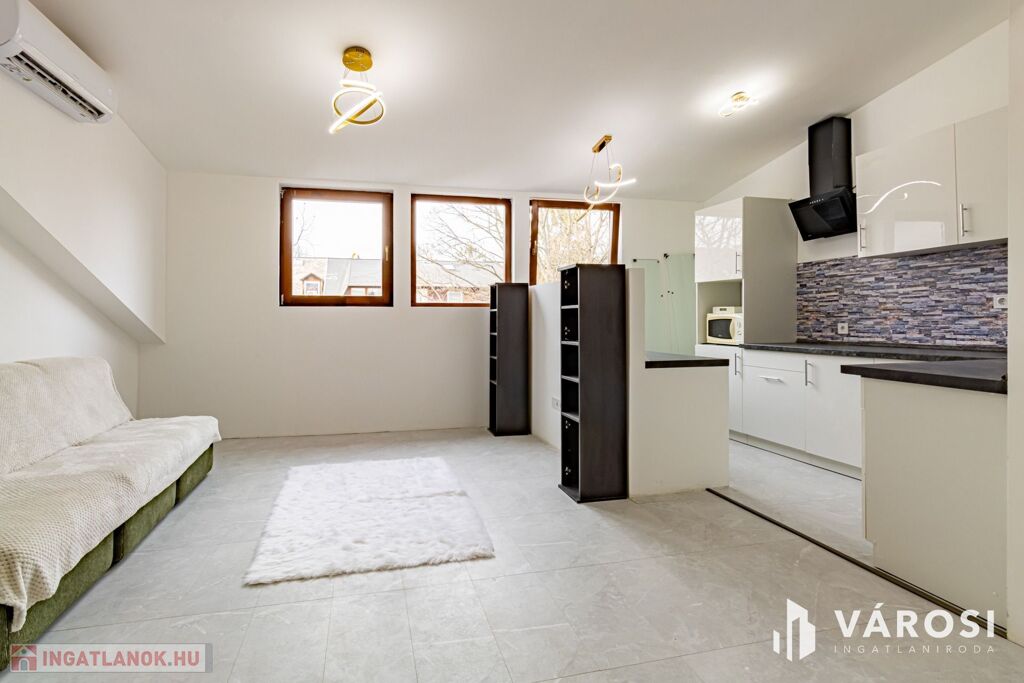For sale in Pomáz, on Deák Ferenc Street, a 38 sqm, attic apartment with a gallery, air-conditioned, brick-built, held in undivided joint ownership but with a usage-sharing agreement, therefore eligible for mortgage financing.
