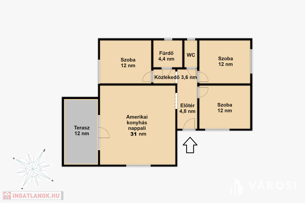 • Amerikai konyhás nappali, 3 db. hálószoba, fürdőszoba, wc.