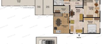 Elosztása: két nagy szoba (egyik akár nappaliként is funkcionálhat), konyha étkező és nappali egyben, fürdőszoba zuhanyzóval, WC-vel és egy nagy előszoba, ami akár dolgozószobaként is használható. A fedett terasz pedig akár egy nyári nappaliként is használható, ahol főzési lehetőség is kialakításra került.