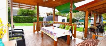 A kerti tereprendezés eredményeként mára egy letisztult, rendezett udvar létesült a ház körül. Megtalálható itt egy fedett (oldalról nyitott) 13 m2 kocsibeálló, egy kerti zuhanyzó víztartállyal, melyet a nap melegít fel nyáron, egy kerti sütögetésre alkalmas tűzrakó, illetve lebetonozásra került egy rész, ami nyáron medence alá kiválóan használható.
