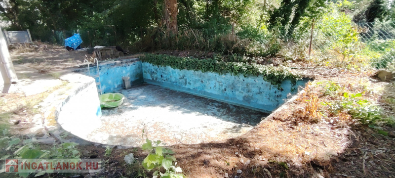 Az udvaron található egy jobb napokat látott épített, 20 nm-es beton medence.