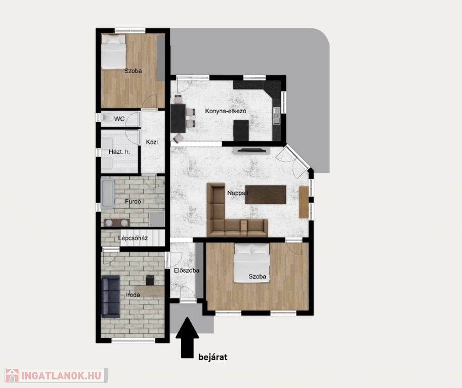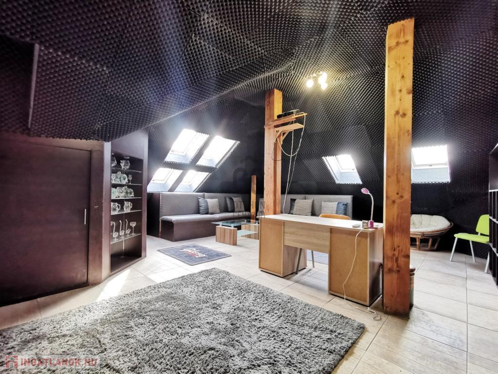 A földszinten tágas, egybenyitott nappali–étkező–konyha fogadja, mellette két hálószoba, külön fürdőszoba és WC. A fedett előtérből nyíló, jelenleg irodaként használt helyiség könnyedén átalakítható garázzsá vagy további szobává, de vállalkozási célokra is ideális.