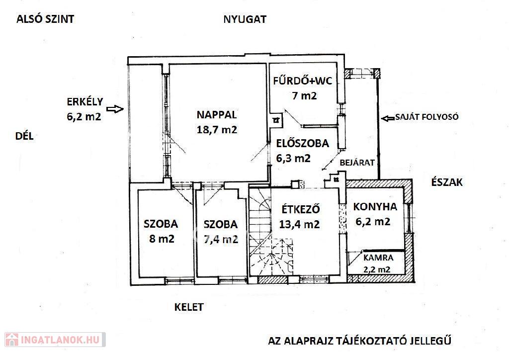 Az alsó szinten egy világos nappali található, amelyből két hálószoba nyílik, továbbá egy nagy étkező, tágas konyha külön kamrával, valamint egy ablakos, kádas fürdőszoba WC-vel kapott helyet.