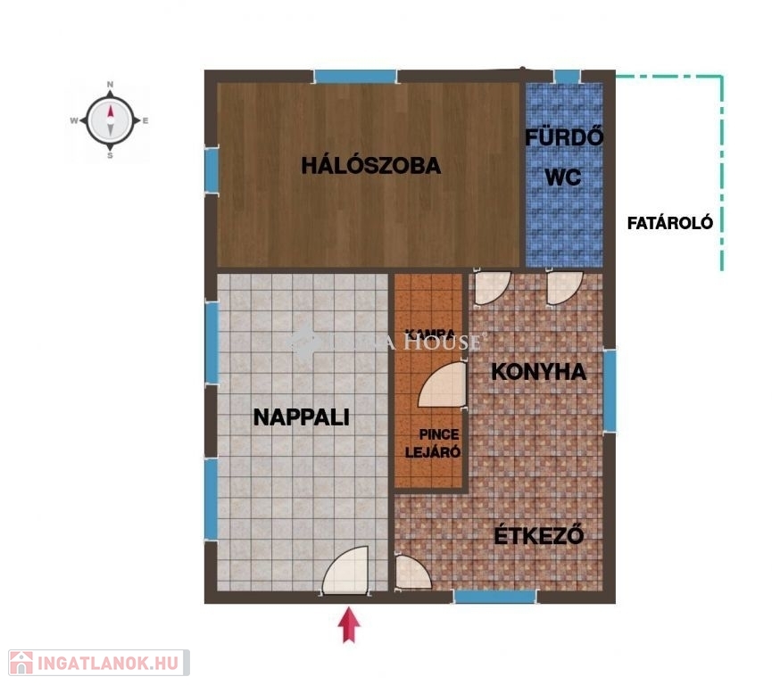 A ház nappali + 1 háló, Konyha-étkező-kamra, és fürdő-wc-vel rendelkezik. Közvetlen mellette fatároló, telken belül egy garázs is elhelyezkedik.