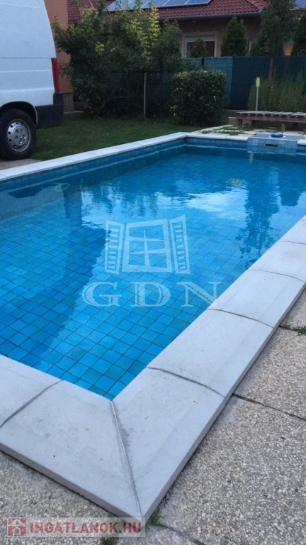 A 720 m2-es füvesített, gondozott, fúrt kúttal ellátott kertben helyet kapott egy gépesített 3x6 méteres medence, valamint egy 2 autó számára helyet adó automata kapuval rendelkezős garázs is.
