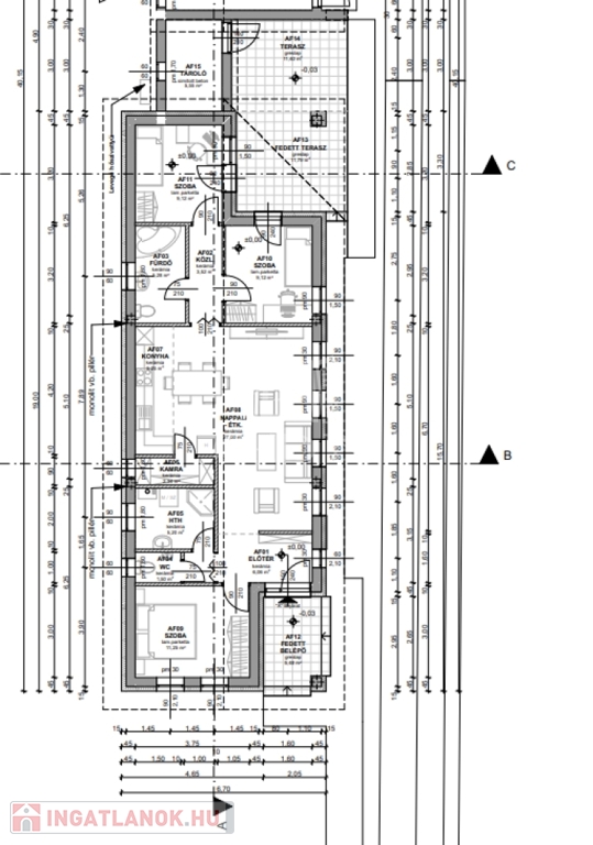 Helyiségei: nappali/étkező 27,00 m2, szoba 11,25 m2, szoba 9,12 m2, szoba 9,12 m2, konyha 5,25 m2, fürdő szoba 5,28 m2, közlekedő 3,52 m2, előtér 6,06 m2, kamra 2,34 m2, wc 1,50 m2, hth 5,20 m2, fedett belépő 5,48 m2 fedett terasz 11,79 m2, terasz 11,40 m2, tároló 5,55 m2.