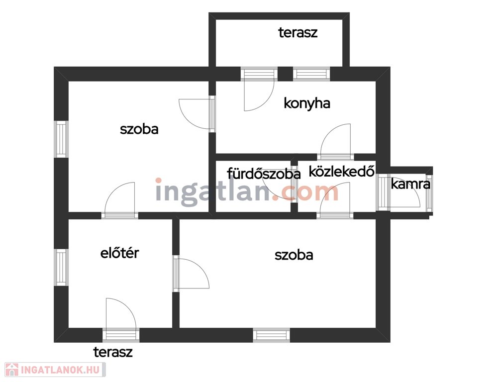 Elosztás:-fedett előterasz, előszoba, 2 külön bejáratú nagy szoba, közlekedő,kamra, fürdőszoba, étkezős konyha. Konyhából kijárat a hátsó fedett teraszra.