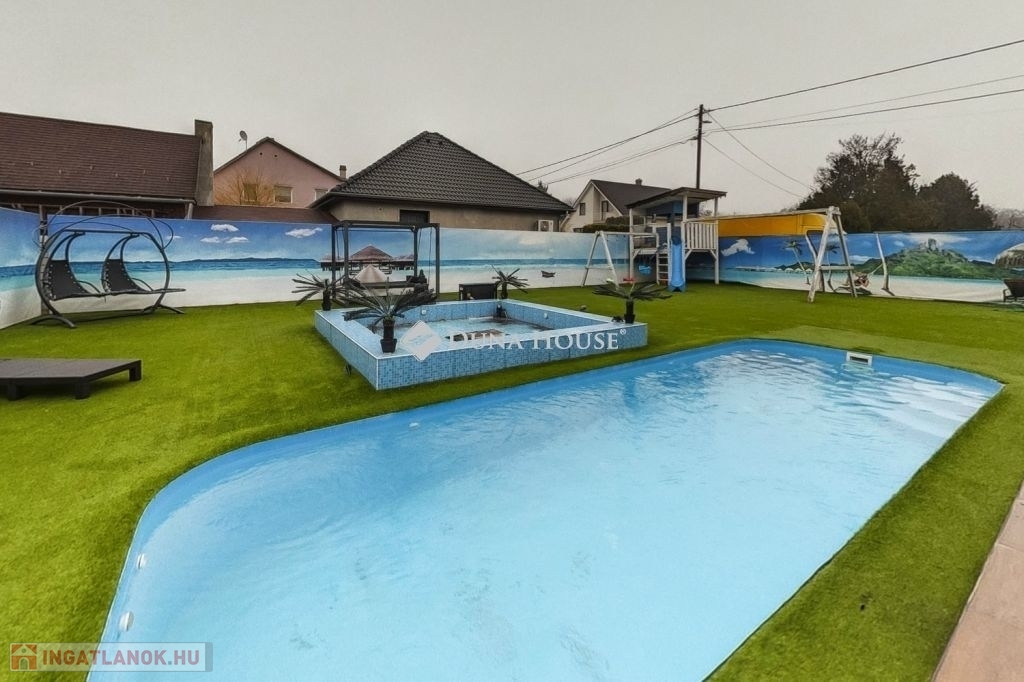 Az épület egy összközműves 742 m²-es telken helyezkedik el, melyen helyet kapott egy 2 nappalis + 5 szobás összesen 260 m²-es hasznos lakótérrel rendelkező lakóépület, egy fedett beálló, egy 40 m²-es fedett, elektromos átlátszó redőnnyel lezárható terasz, kerti tároló, játszótér, szökőkút és egy medence.