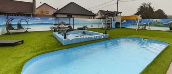 Medence: földbe süllyesztett, mérete: 8 x 3 m, mélysége: 1/1,55 m.