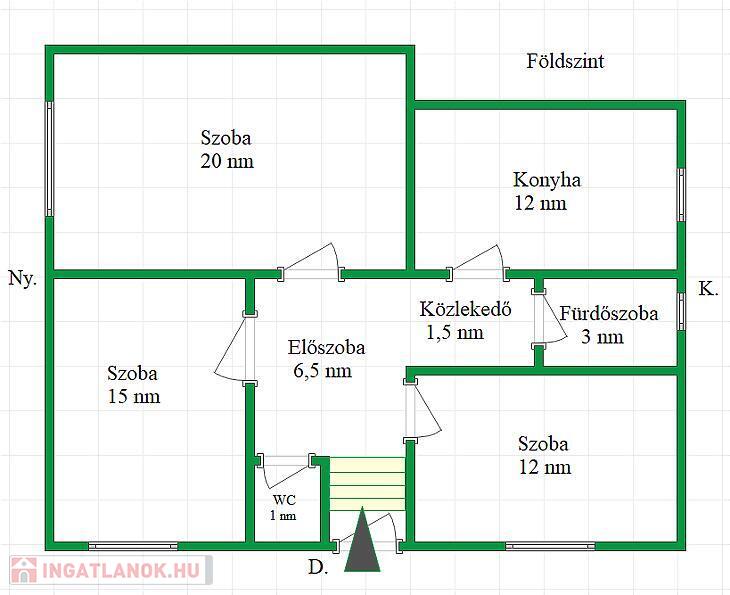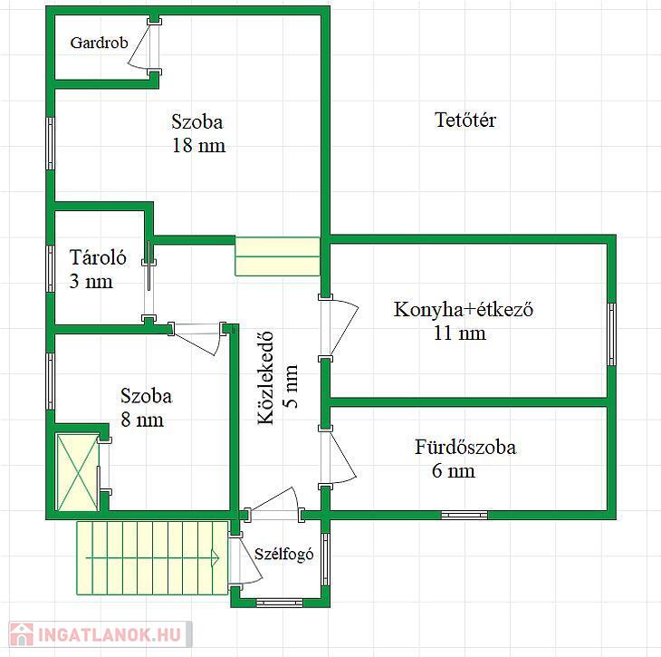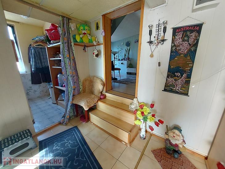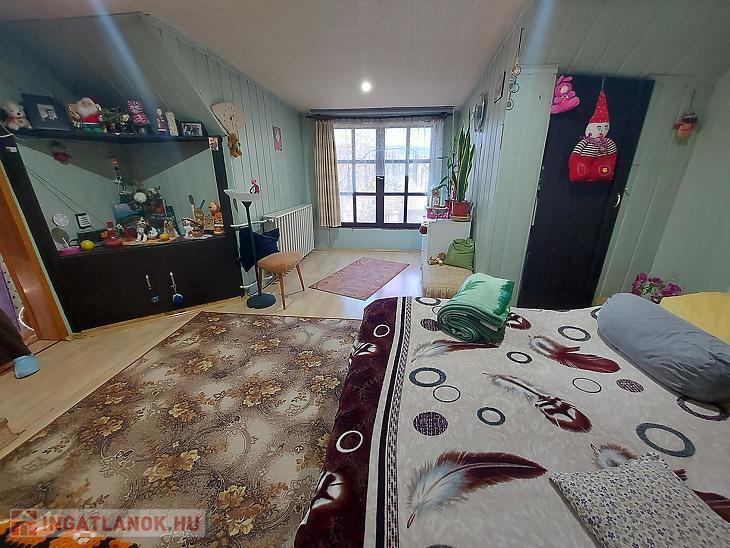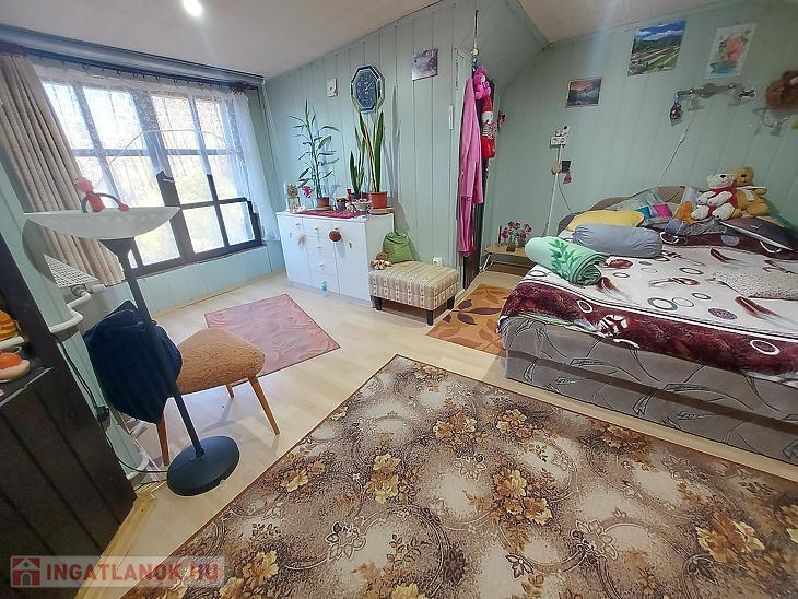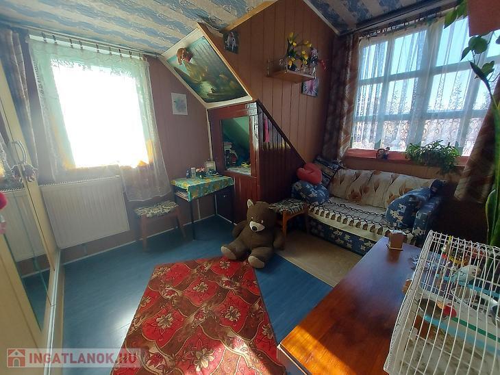 A földszinti lakrész 70 nm, 3 db szoba, konyha, fürdőszoba, előszoba és tároló található.