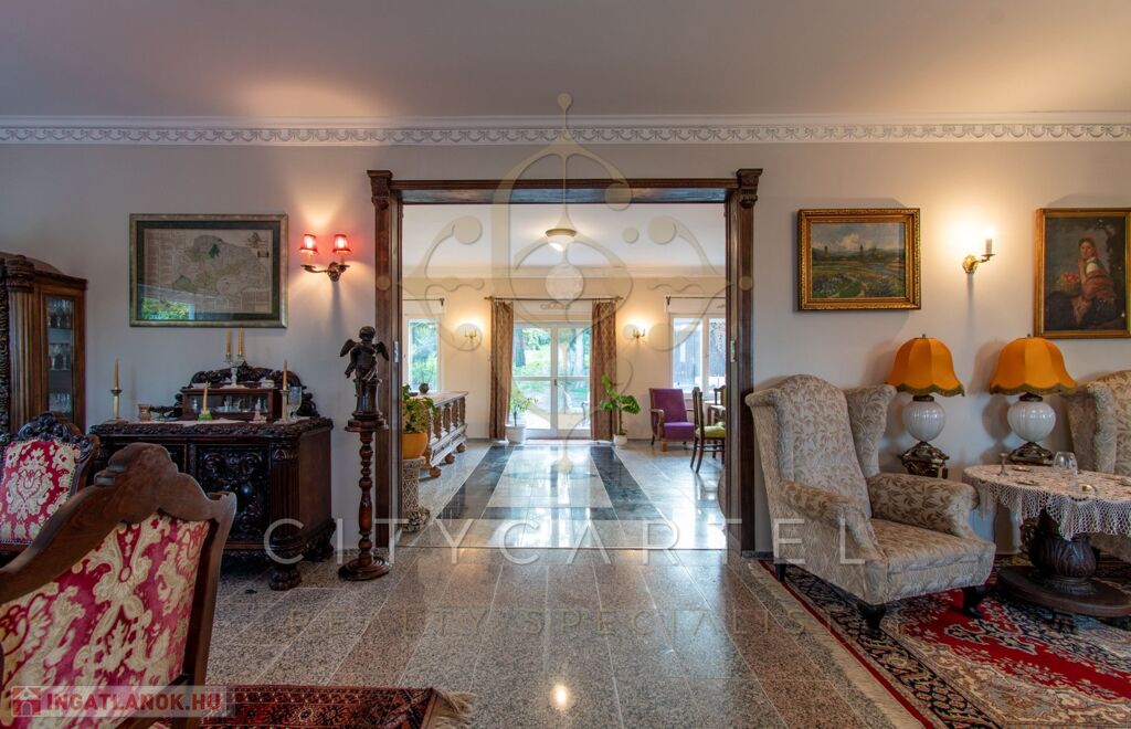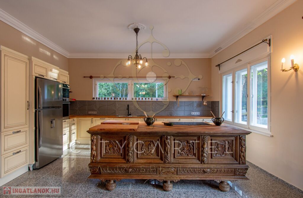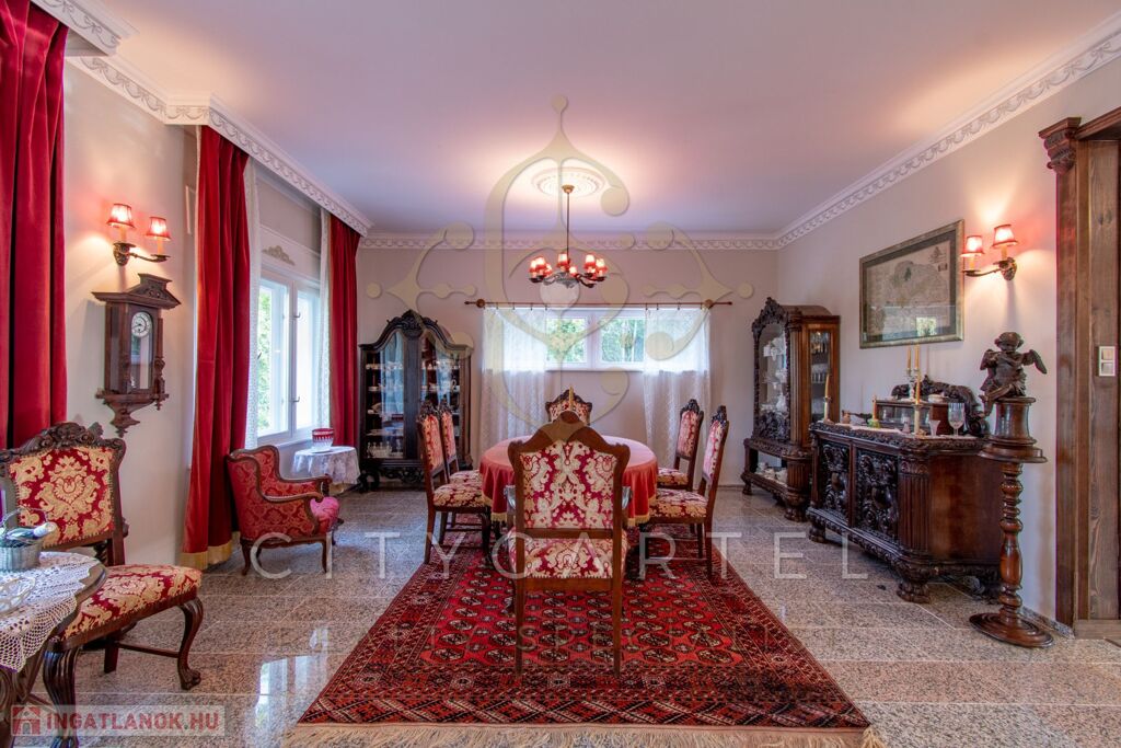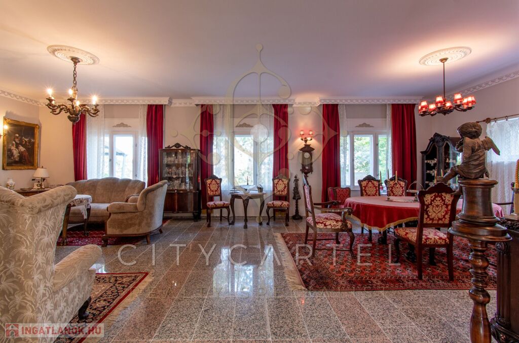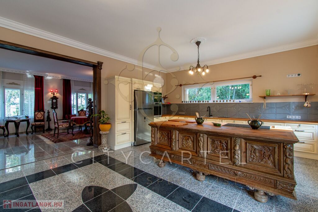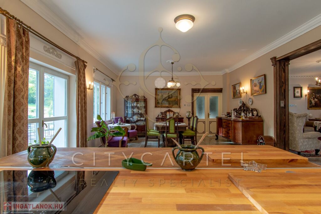 - felújított főépület 500 nm (Lakószint: konyha, ebédlő-társalgó, nappali-hall, kamra, office, lépcsőház, folyosó, powderroom, hálószoba, fürdőszoba káddal és zuhannyal, open concept lakosztály hálóval, fürdővel káddal és zuhannyal valamint bidés WC-vel és garderobe-bal, 2 terasz, Alagsor: garázs, csizmaszoba, folyosó, mosókonyha, mosdó – zuhany – bidés WC, appartament konyhával, hálófülkével, fürdőszoba káddal és WC-vel, amennyiben igény van rá, teljesen bútorozva)