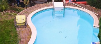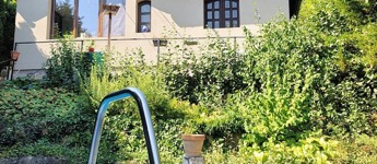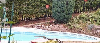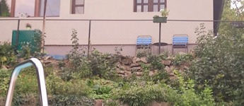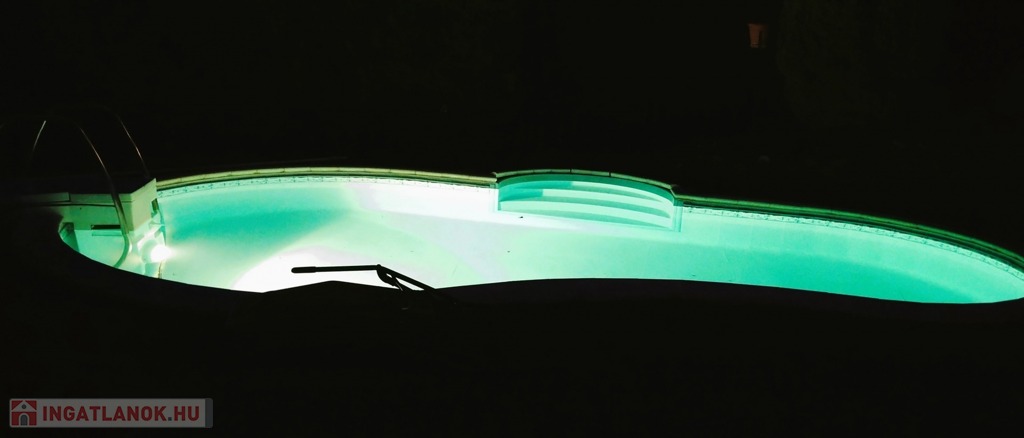 Az udvaron hangulatos, megvilágítható „fóliázott” (nem csempés) medence, fedett autóbeálló, tűzrakóhely, sziklakert, ősfák és dísznövények találhatók.
