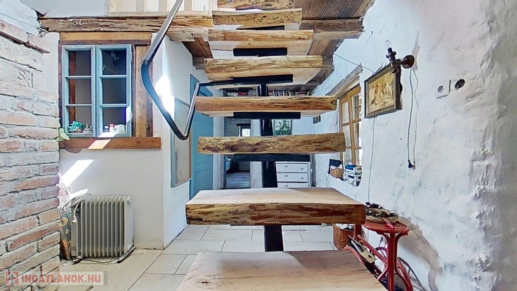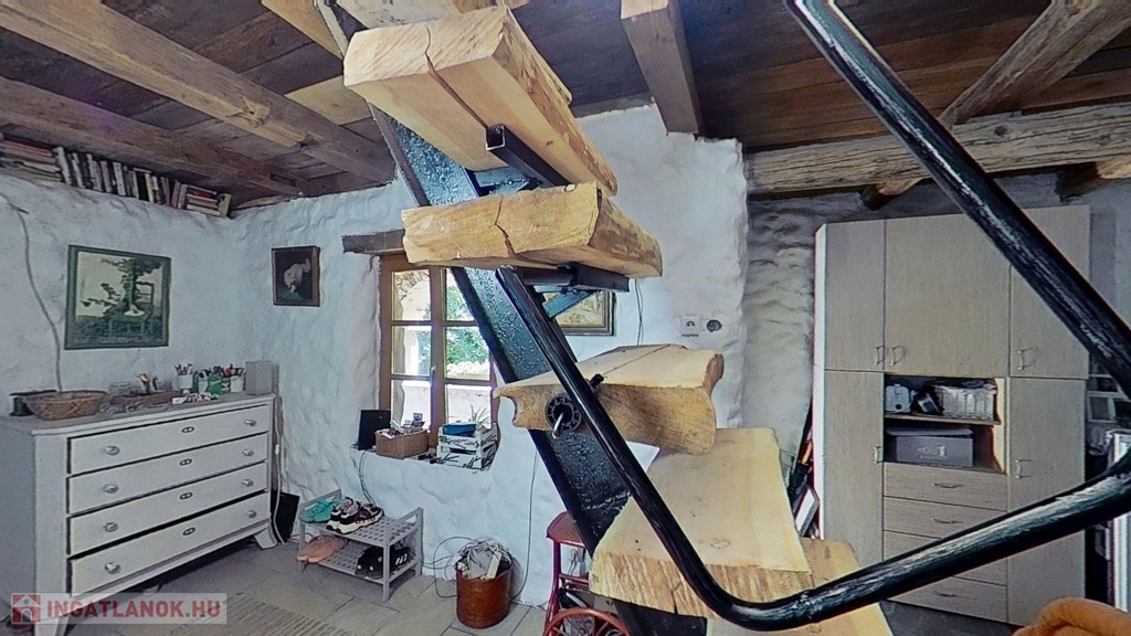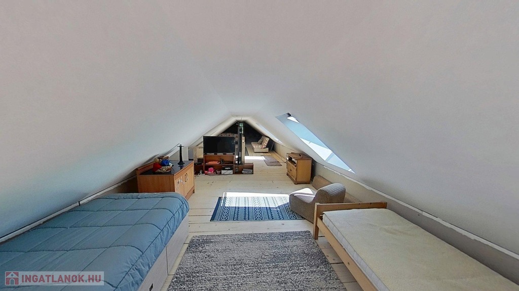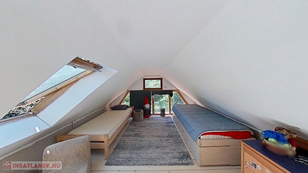A tetőtér további egy 32,5 m2-es hálószobát foglal magába, mely egy légtér jelenleg, de igény szerint ketté osztható. A szinteket egyedi kézműves rönkfa lépcső köti össze.