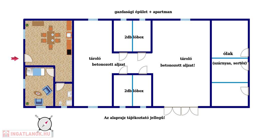 A másik épületegyüttesben szoba-konyha-fürdő apartman és a gazdasági épületek találhatók.