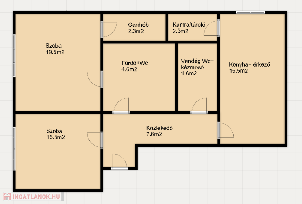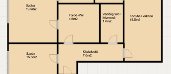 -2 nagy szoba, nagy konyha+étkező, fürdő+Wc, külön vendég WC + kézmosó, gardrób és tároló.