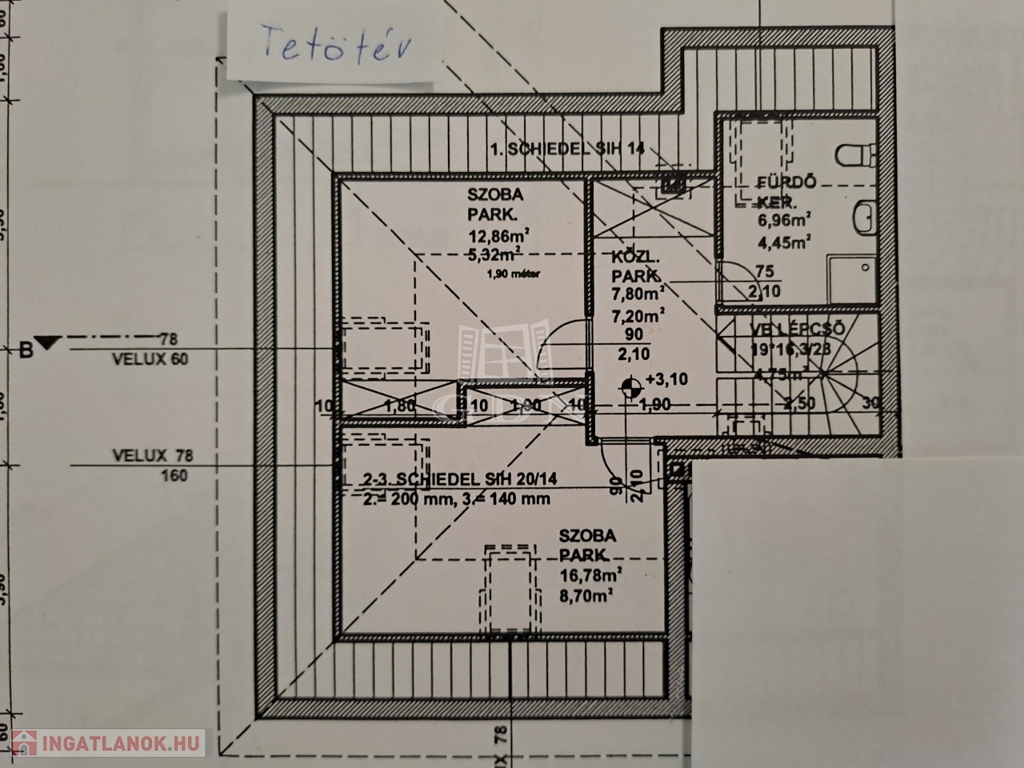 Az emeleten további két szoba (12,8 és 16,7 m²), egy nagyobb fürdőszoba (6,9 m²) és egy praktikus gardrób kapott helyet.
