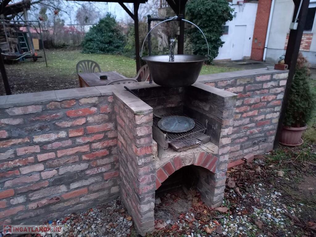 A kertben fedett kiülő és sütögető nyújt árnyékot nyáron.
