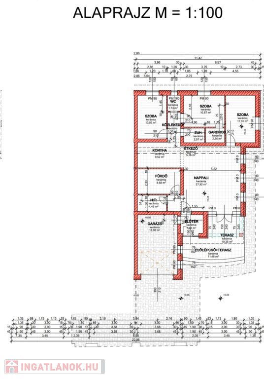 A 18nm-es garázs, illetve a 27nm-es, részben fedett terasz mellett a lakóingatlan nettó 100nm-es nagysággal rendelkezik.