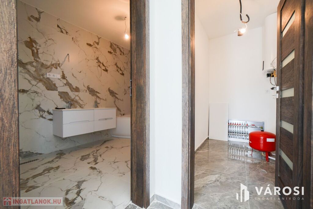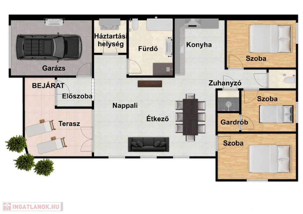 -bruttó 145nm-es ikerház( 3 lakószobával,2 fürdőszobával(duplakomfortos), külön wc-vel, háztartási helyiséggel, közlekedővel és amerikai konyhás nappali(18nm-es garázs, 27nm-es terasz és 107nm-es lakóingatlan